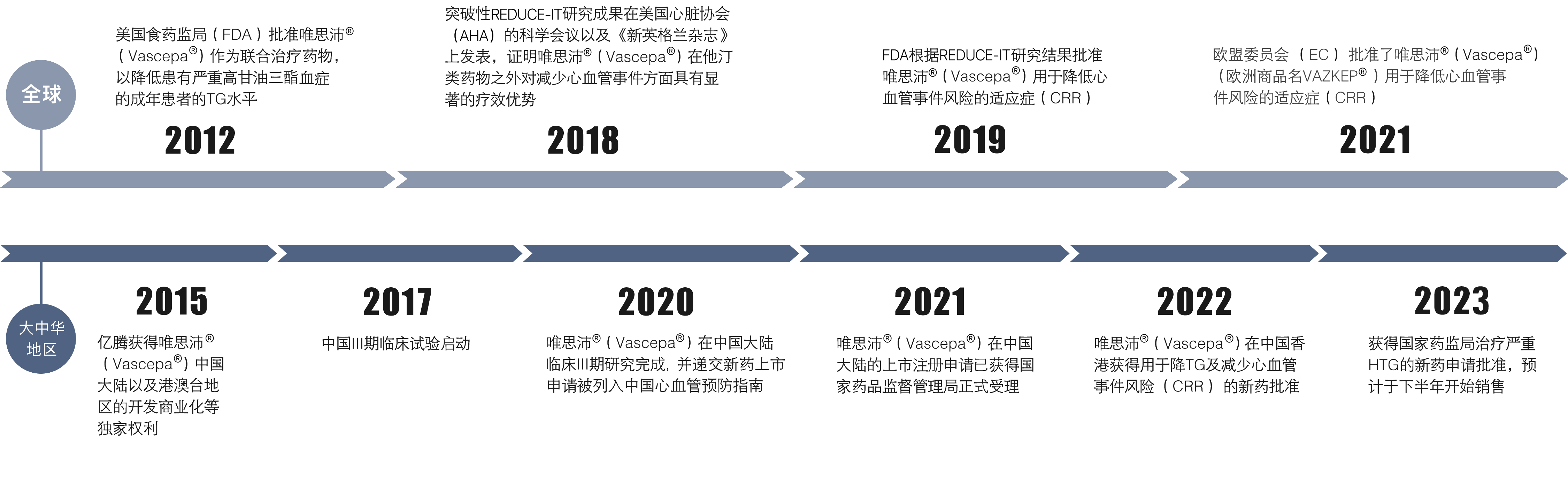 唯思沛®(Vascepa®),IPE(Icosapent Ethyl,二十碳五烯酸乙酯)是一种单分子产品,是omega-3脂肪酸(二十碳五烯酸EPA)的高度纯化的乙酯。Vascepa®是唯一获FDA批准作为最大耐受性他汀类药物治疗的辅助药物,用于降低靶向高危患者的持续心血管风险。根据交叉试验对比,在他汀类药物治疗基础上,Vascepa®在降低心血管事件风险方面的疗效显著,优于依伏库单抗(一种PCSK-9抑制剂)及依泽替米贝(一种胆固醇吸收抑制剂)。唯思沛®2023年在中国获批。